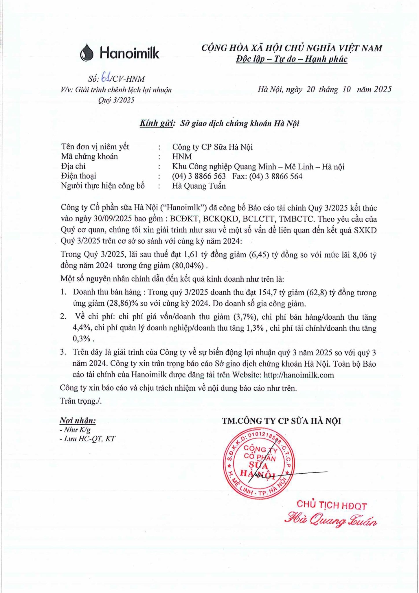 CV: SỐ 61/CV-HNM GIẢI TRÌNH CHÊNH LỆCH LỢI NHUẬN QUÝ 3/2025 20/10/25 hoan chinh Các bài viết liên quan BÁO CÁO TÀI CHÍNH QUÝ 3 NĂM 2025 KẾT THÚC TẠI NGÀY 30/09/2025 CV SỐ: 44/CV-HNM GIẢI TRÌNH CHÊNH LỆCH LỢI NHUẬN BÁO CÁO BÁN NIÊN 2025 THAY ĐỔI TRÊN 10% SO VỚI CÙNG KỲ NĂM TRƯỚC BÁO CÁO TÀI CHÍNH GIỮA NIÊN ĐỘ ĐÃ ĐƯỢC SOÁT XÉT CHO KỲ KẾ TOÁN 06 THÁNG KẾT THÚC NGÀY 30 THÁNG 06 NĂM 2025 CV SỐ: 38/CV-HNM GIẢI TRÌNH CHÊNH LỆCH LỢI NHẬN QUÝ 2/2025 BÁO CÁO TÀI CHÍNH QUÝ 2 NĂM 2025 KẾT THÚC TẠI NGÀY 30/06/2025